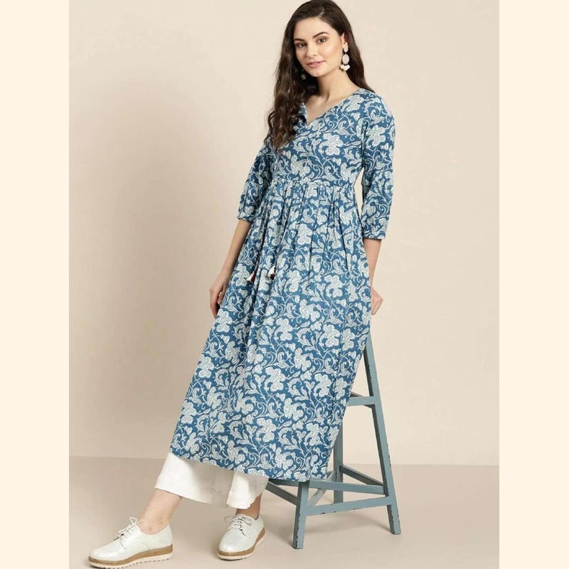 Elegant Blue Floral Printed A-Line Kurta. Designed with a round neckline and front tie-up tassel detail, this kurta features a beautiful all-over floral print that adds charm and sophistication.