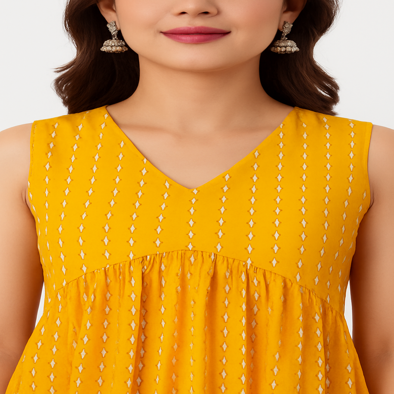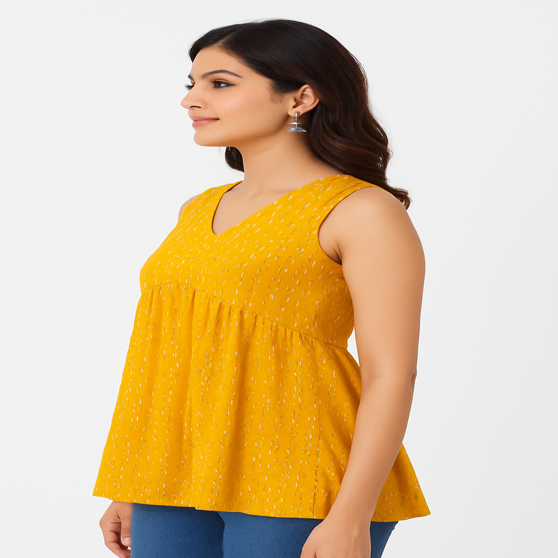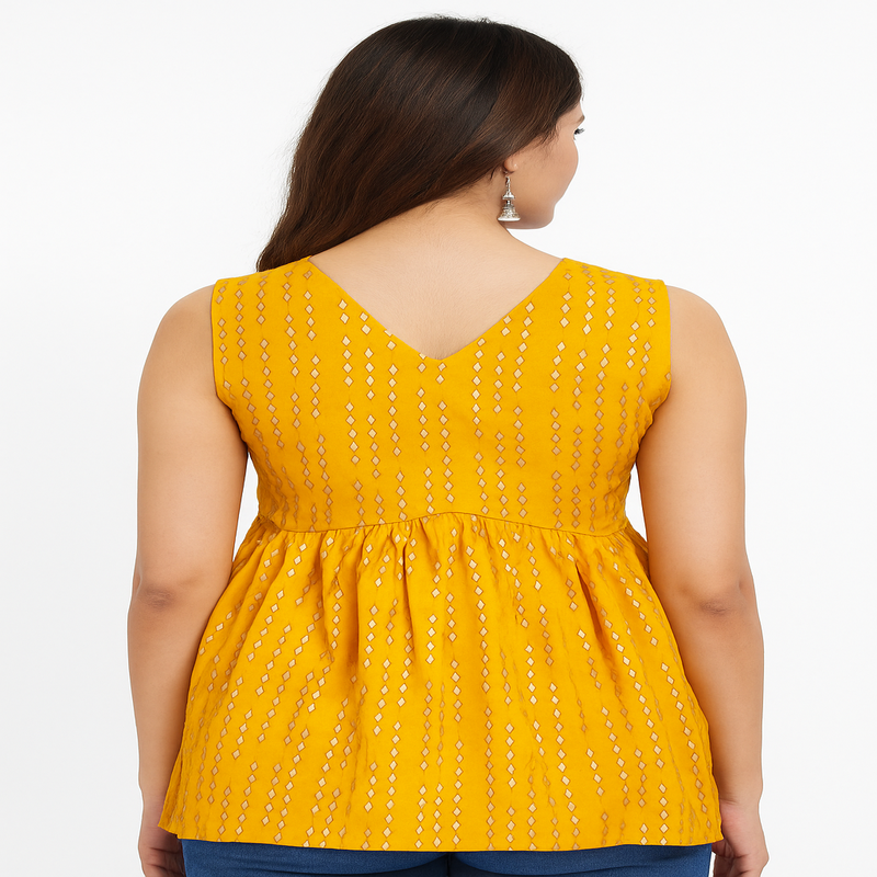 Bring effortless charm to your everyday look with our Golden Glow Sleeveless Cotton Peplum Top. Featuring a V-neckline and sleeveless cut, it’s perfect for both casual outings and festive gatherings. Pair it with denim or palazzos for a breezy, chic style that never goes out of fashion.