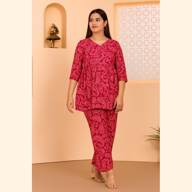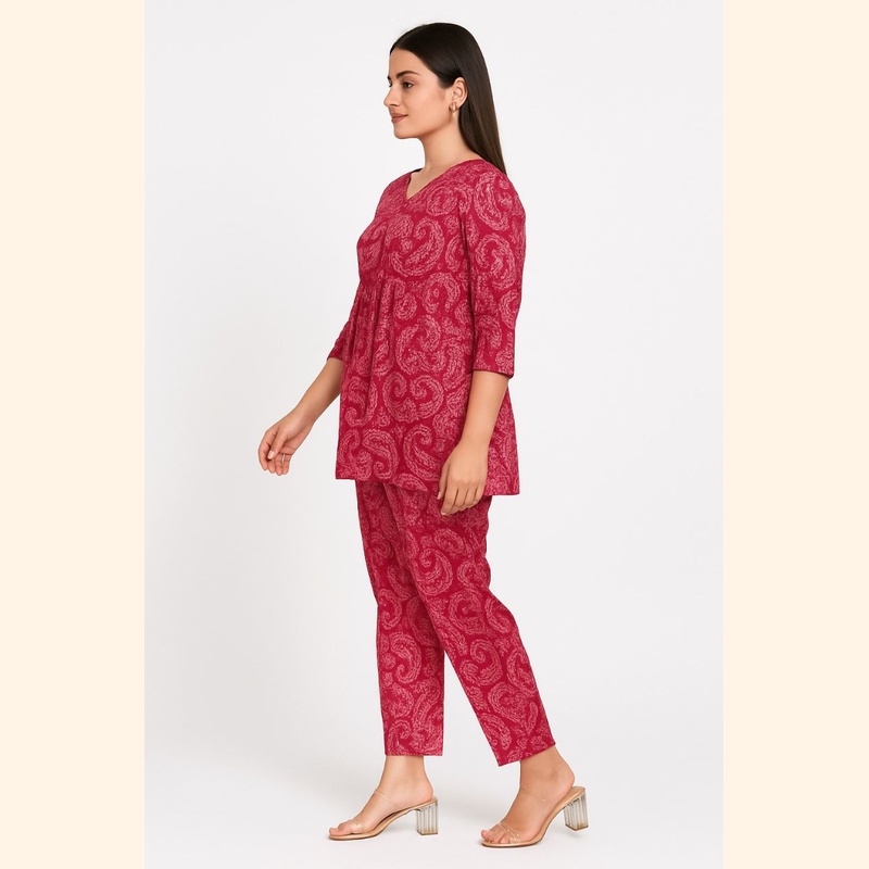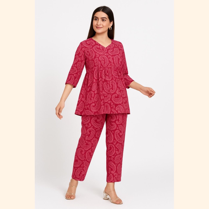 The set includes a V-neck, 3/4th sleeve peplum-style top paired with matching straight-fit pants. The rich red base with paisley prints creates a timeless look, while the relaxed fit ensures all-day comfort.
